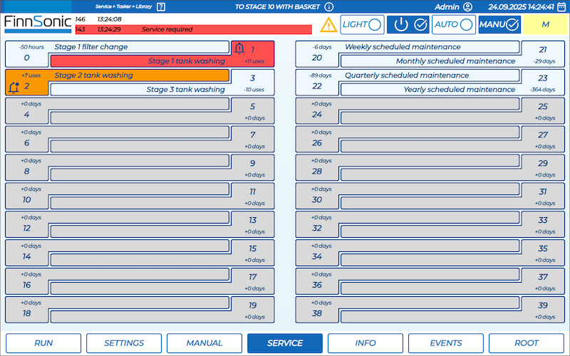 - Service Tasker: Customize up to 40 tasks based on time, input signals, basket quantities, and more. Soft and hard limits ensure timely maintenance with early warnings and alarms. Configurable user access levels and detailed service instructions enhance operational control and efficiency.